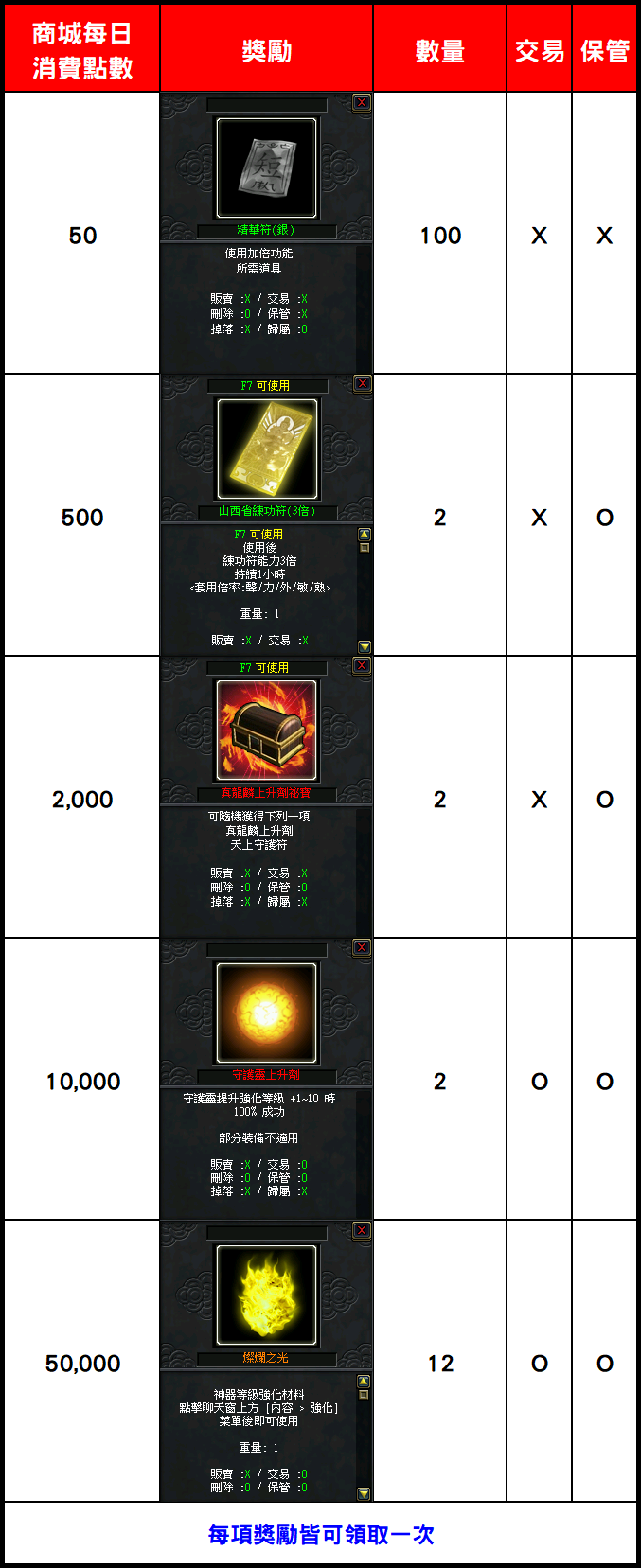 活動期間每日 00:00~23:59 消費達指定條件,即可領取對應之獎勵!