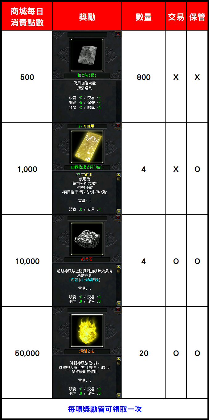 活動期間每日 00:00~23:59 消費達指定條件,即可領取對應之獎勵!