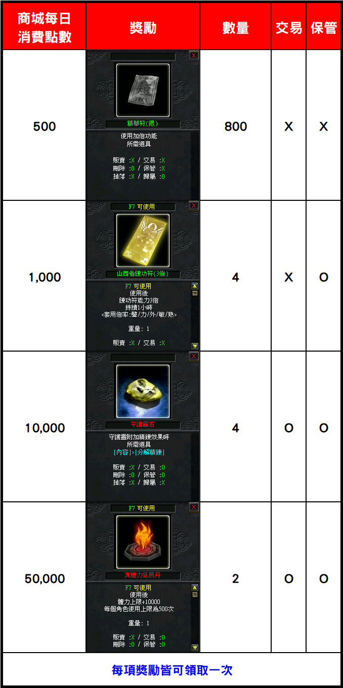 活動期間每日 00:00~23:59 消費達指定條件,即可領取對應之獎勵!