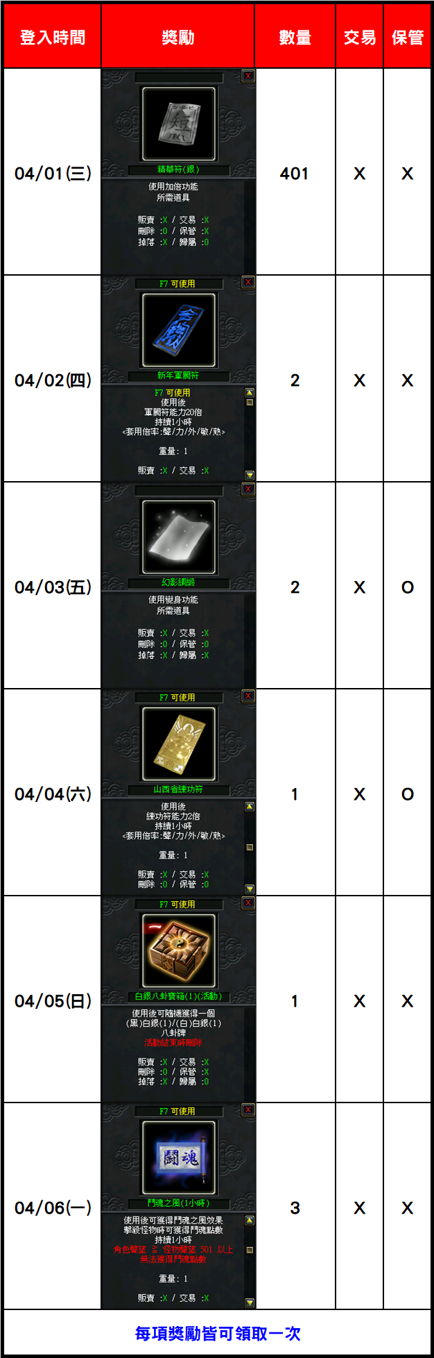 於特定日期的00:00~23:59之間,角色登入遊戲即可領取獎勵。