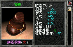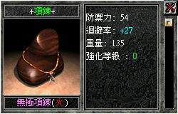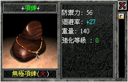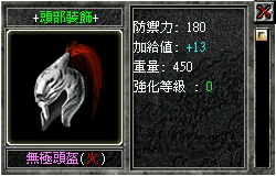 無極頭盔+無極項鍊套裝組 1.無極頭盔(火屬性):防禦180、無強化、原重、五行加給值+13。 2.無極項鍊(火屬性):防禦54、迴避率+27、無強化、原重。 |