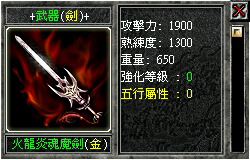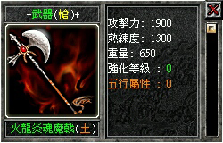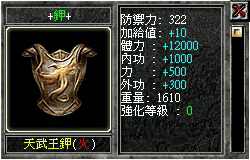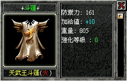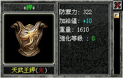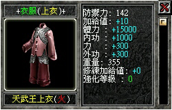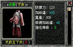 天武王上下衣套裝組 1.天武王上衣(火屬性):無強化、原重、五行加給值+10。 2.天武王下衣(火屬性):無強化、原重、五行加給值+10。 |