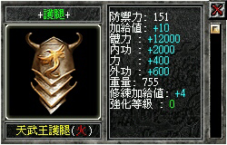天武王斗腿套裝組 1.天武王斗篷(火屬性):無強化、原重、五行加給值+10。 2.天武王護腿(火屬性),修練加給值+4:無強化、原重、五行加給值+10。 |