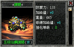 玉琉仙鋼護腿乙個:屬性自選,五行加給+13、原重、修練加給值+6、無強化、念力(修練)+6,非套裝之護腿。 |