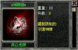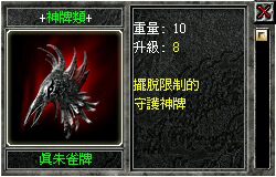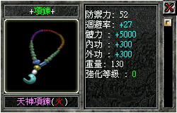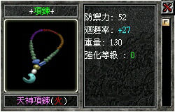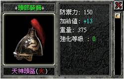 天神頭盔+天神項鍊套裝 1.無極頭盔(火屬性):防禦150、無強化、原重、五行加給值+13。 2.無極項鍊(火屬性):防禦52、迴避率+27、無強化、原重。 |