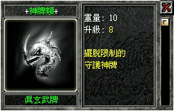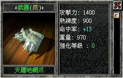 天武王鉀靴套裝組 1.天武王鉀(火屬性):無強化、原重、五行加給值+10。 2.天武王靴(火屬性),修練加給值+4:無強化、原重、五行加給值+10。 |