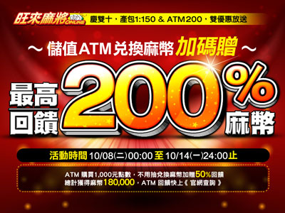 活動期間使用ATM成功儲值1000元整,系統贈送200點,總計獲得1200點,於「旺來銀行」點數兌換麻幣設定,將1200點兌換120,000麻幣,於活動當日23:00進行結算將獲得50%回饋60,000麻幣。