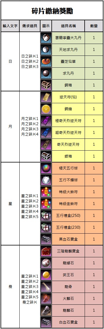 活動期間找洛陽城中央警衛(94,292)進行[碎片繳納]對話,可輸入「日」、「月」、「星」、「晨」其中一項,來進行碎片繳納並獲得獎勵
